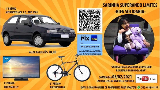 E assim vamos todos  juntos nesta caminhada com  a Sarinha….segue abaixo a forma que se pode colaborar em doação e também foi criada uma rifa.