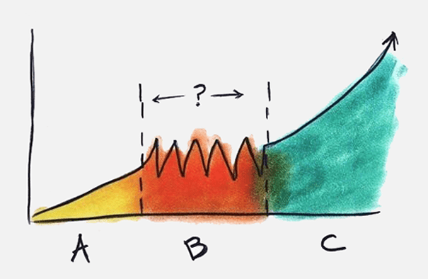 O segundo desafio a ser superado é o crescimento do negócio, cujos obstáculos estão diretamente atrelados às vendas. O gráfico abaixo, sobre a receita ao longo do tempo, ilustra as 3 principais fases pelas quais a maioria dos empreendedores passam:
