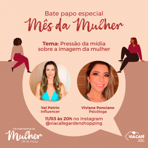 A busca pela autoaceitação, evidenciando o empoderamento feminino, a saúde, a beleza, a autoestima e os padrões de beleza impostos pela sociedade. Assuntos tão importantes e que fazem parte da rotina de tantas mulheres serão abordados de forma simples e direta em um bate papo descontraído e virtual, promovido pelo Via Café Garden Shopping para celebrar o a Semana das Mulheres. A live especial com tema “A pressão da mídia sobre a imagem da mulher” será realizada pela psicóloga, Viviane Ponciano Mello, e pela influencer, Val Petrin, na quinta-feira, dia 11 de março, às 20h, no Instagram @viacafegardenshopping.