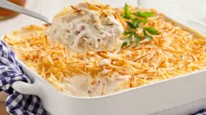 6. Retire do forno e finalize com batata palha, sirva quentinho.