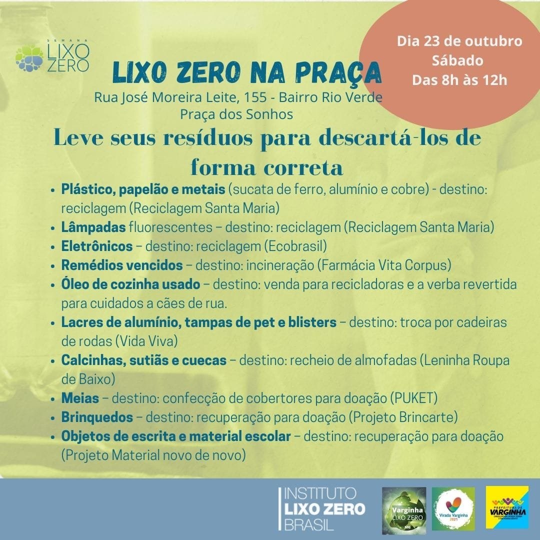 Entre os dias 22 a 31 de outubro está acontecendo a 1ª Semana Lixo Zero de Varginha. O evento é mobilizado pelo Coletivo Varginha Lixo Zero (@varginhalixozero) em parceria com o Instituto Lixo Zero Brasil, responsável pela organização em âmbito nacional. A atividade presencial inicialmente prevista para acontecer na Praça da Mina foi transferida para a “Praça que será inaugurada no bairro Rio Verde.