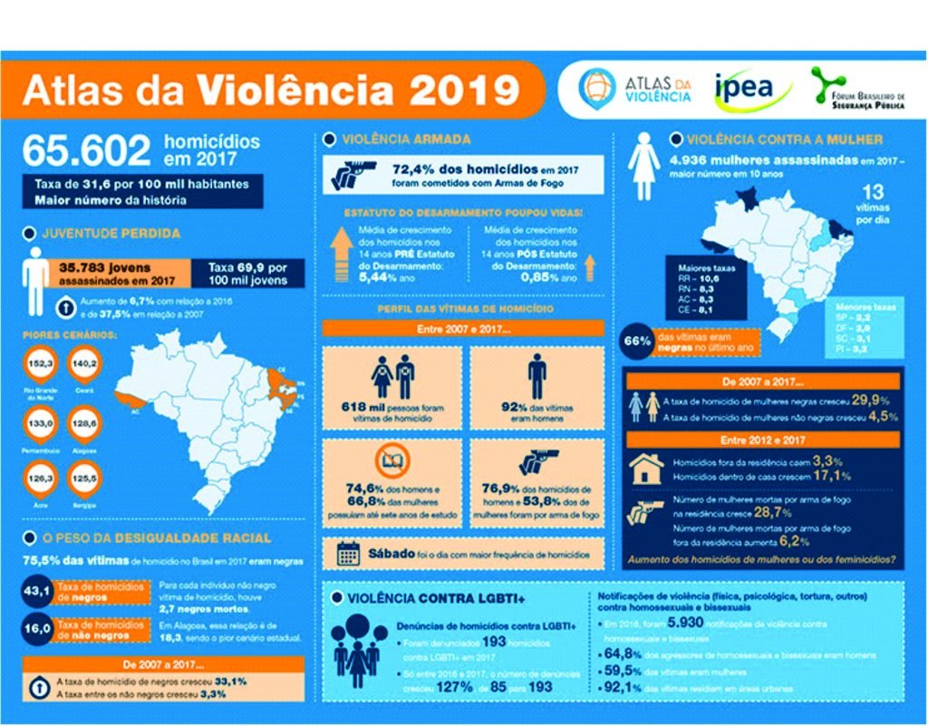 A edição de 2019 do “Atlas da Violência”, abordou a conjuntura da violência letal no Brasil; homicídios nas unidades federativas; juventude perdida; violência contra a mulher; violência contra negros; violência contra a população LGBTI+; o perfil dos homicídios no Brasil; armas de fogo; mortes violentas com causa indeterminada e qualidade dos dados; por políticas de segurança pública baseadas em evidências e em uma gestão federativa.
